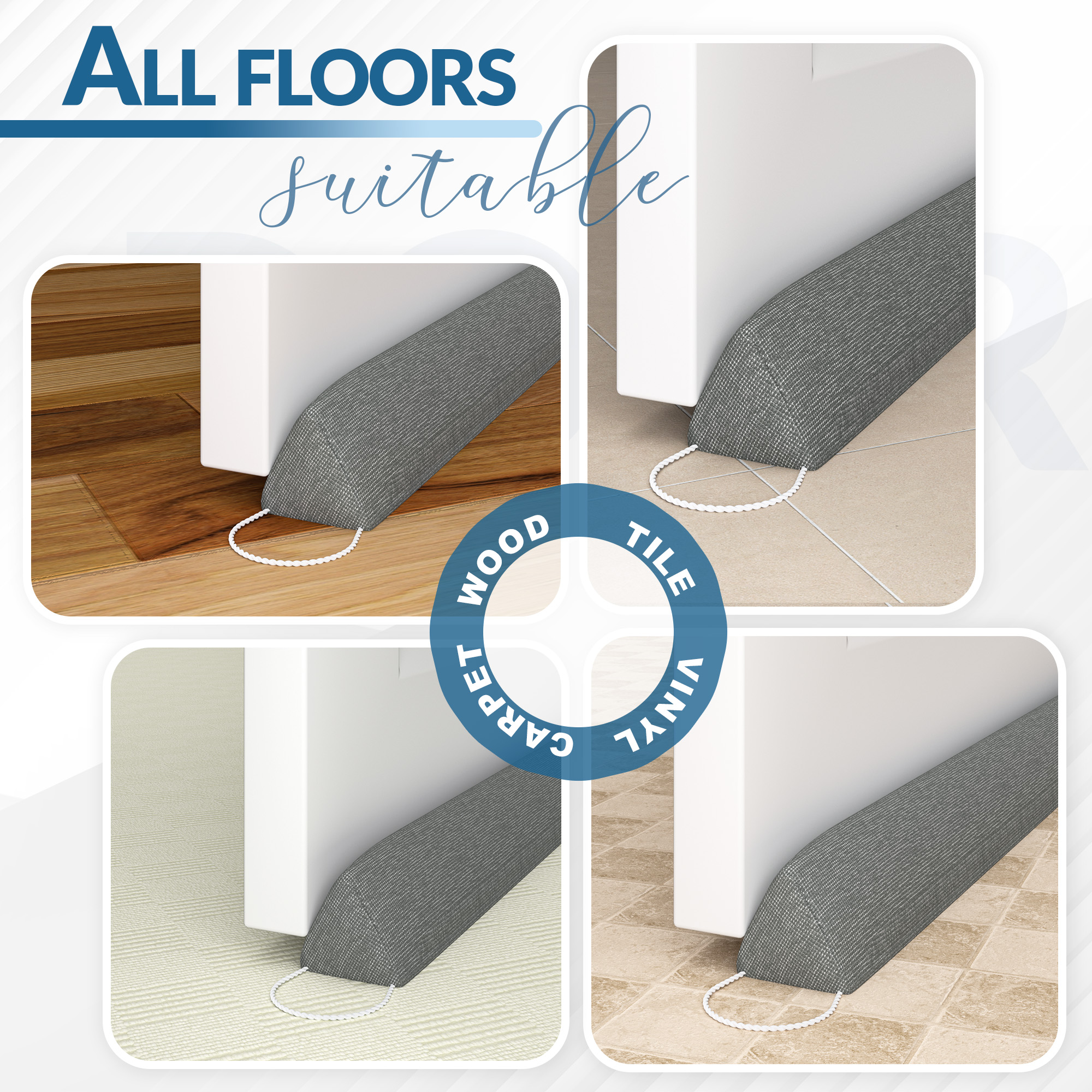 WHY CHOOSE US: Our sound proof door snake draft designed very user-friendly. Just use your foot to hold the doorstop in place. Needn’t have to bend down to manually adjust and secure the doorstop every time. The soft texture and the high wear resistance allow it to be used on carpet, tile, marble, wood, or vinyl without making any scratches.
